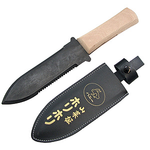 The Hori Hori Knife has a straight edge and a serrated edge and can cut plant roots, weed and be used for digging and planting. The modern Hori Hori Knife is slightly smaller than the Japanese short sword (shoto – wakizashi). Gardeners interested in having the versatile Hori Hori Knife to use in their own gardens have their choice of dozens of designs, some of carbon steel, and others of stainless steel. Most come with a scabbard.